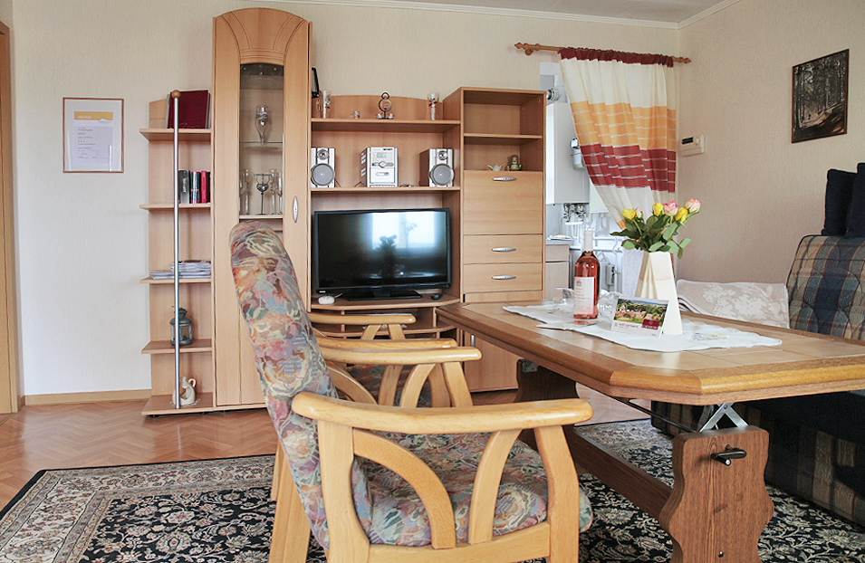 Zur Ausstattung des Wohnraumes zählen eine Musikanlage, ein Flachbildfernseher mit Sat-TV, |