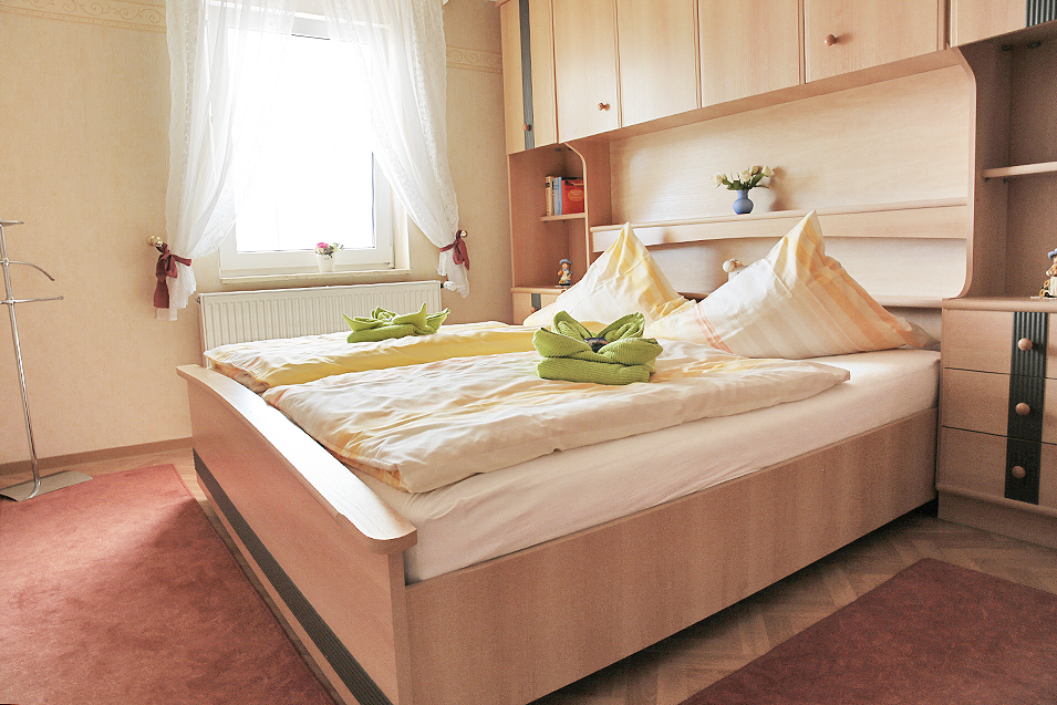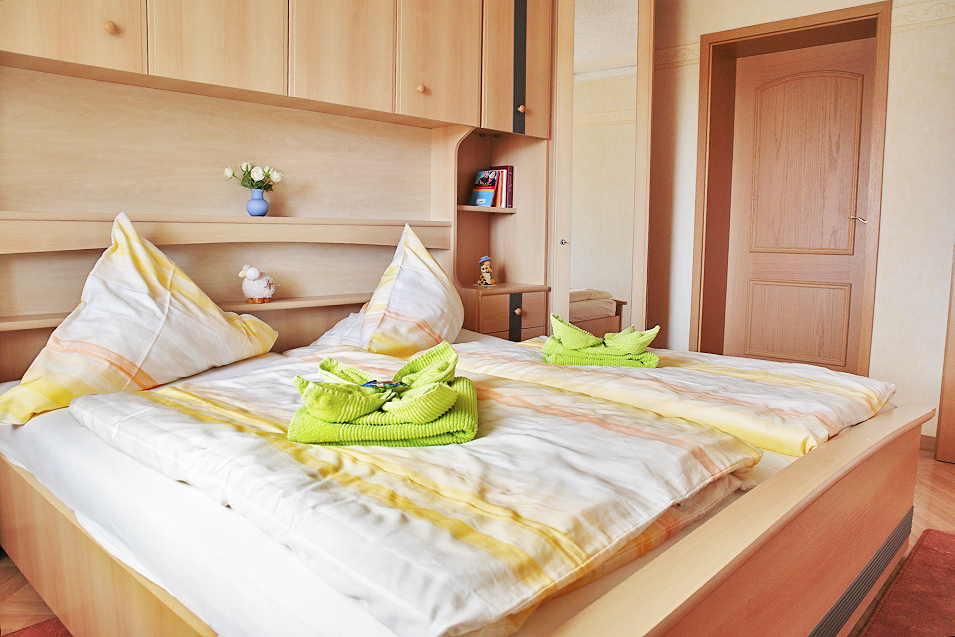 Unser Schlafzimmer verfügt über ein Allergiker-Doppelbett. |