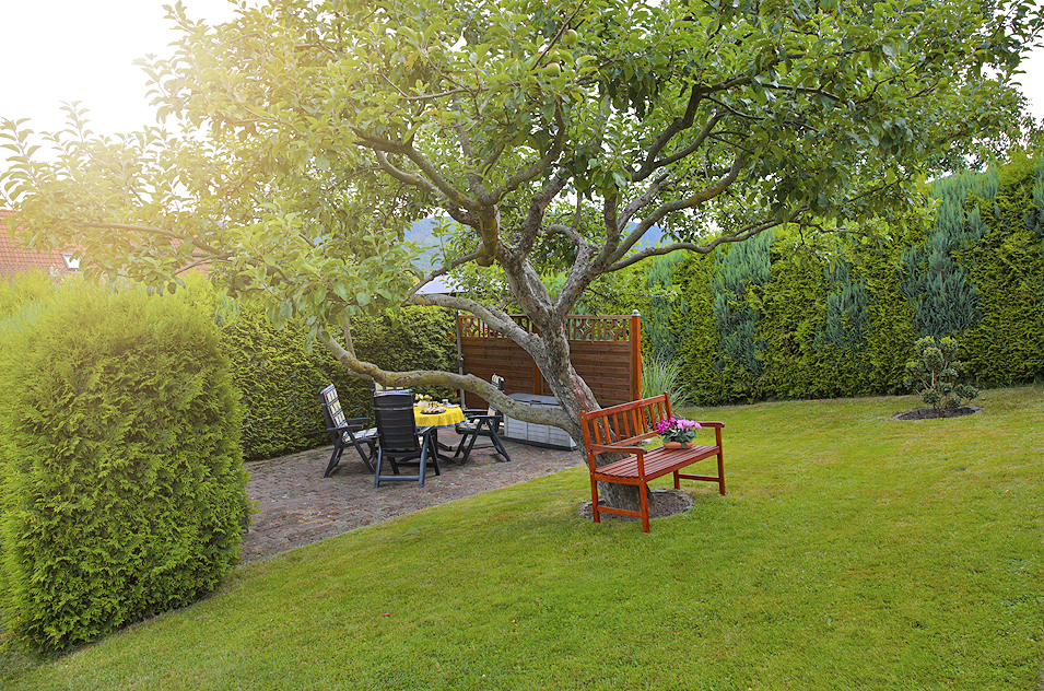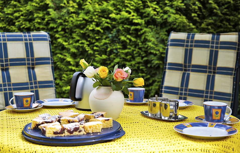 Der Garten um das Fereinhaus kann gerne genutzt werden. Eine gemütliche Sitzecke läd zum Entspannen bei einer guten Tasse Kaffee und einem Stück Kuchen ein. Sie erreichen den Garten, sowie das Fereinhaus über den seperaten Eingang. |
